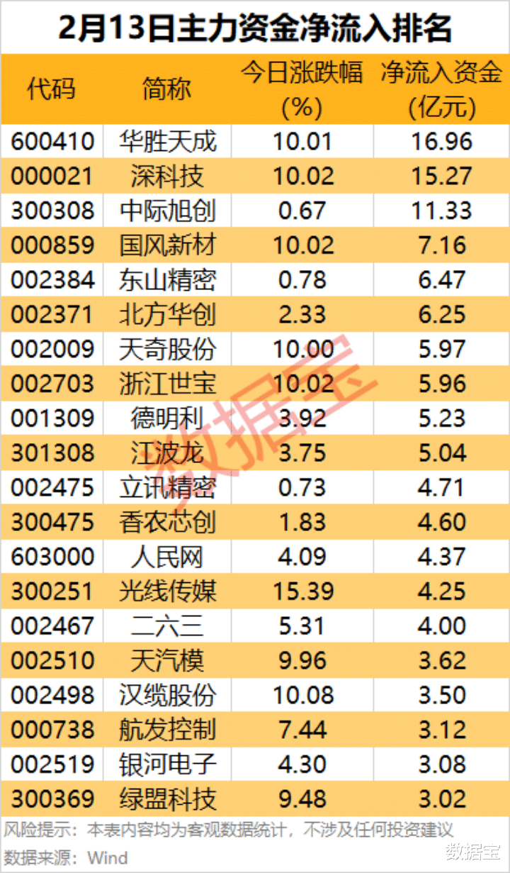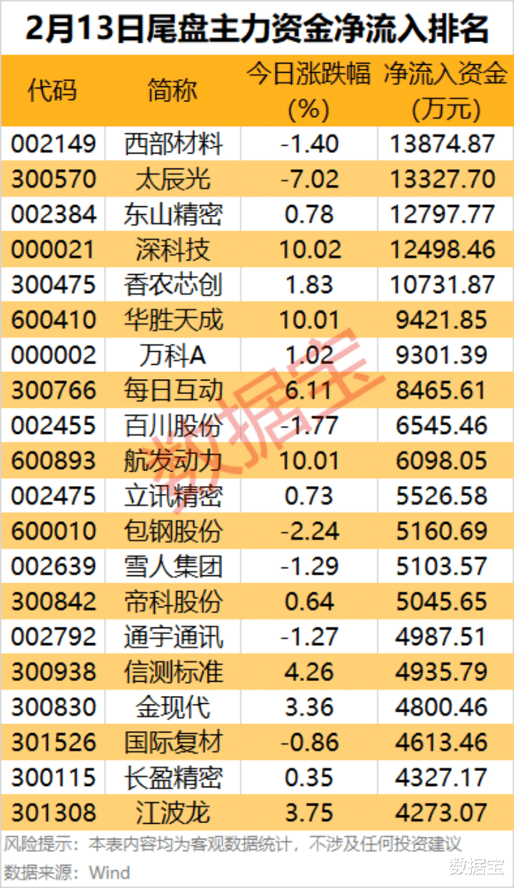 此外,还有太辰光、东山精密、深科技、香农芯创和华胜天成等尾盘主力资金净流入金额居前。
