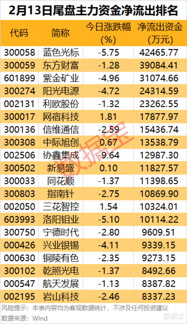 据证券时报·数据宝统计,本日(2月13日)沪深两市主力资金净流出344.04亿元,其中创业板净流出208.69亿元,沪深300成份股净流出35.59亿元。