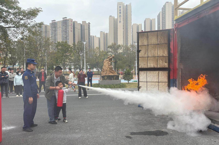 随后进行的实操环节更是将气氛推向高潮。面对油盆中腾起的火焰,消防员现场演示灭火器“提、拔、握、压”的使用要领。在专业指导下,参与家庭从初次尝试时的紧张,到成功扑灭火苗时的从容,完成了一次从理论到实践的完整安全课。