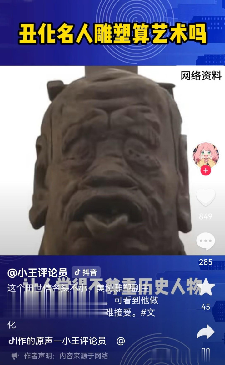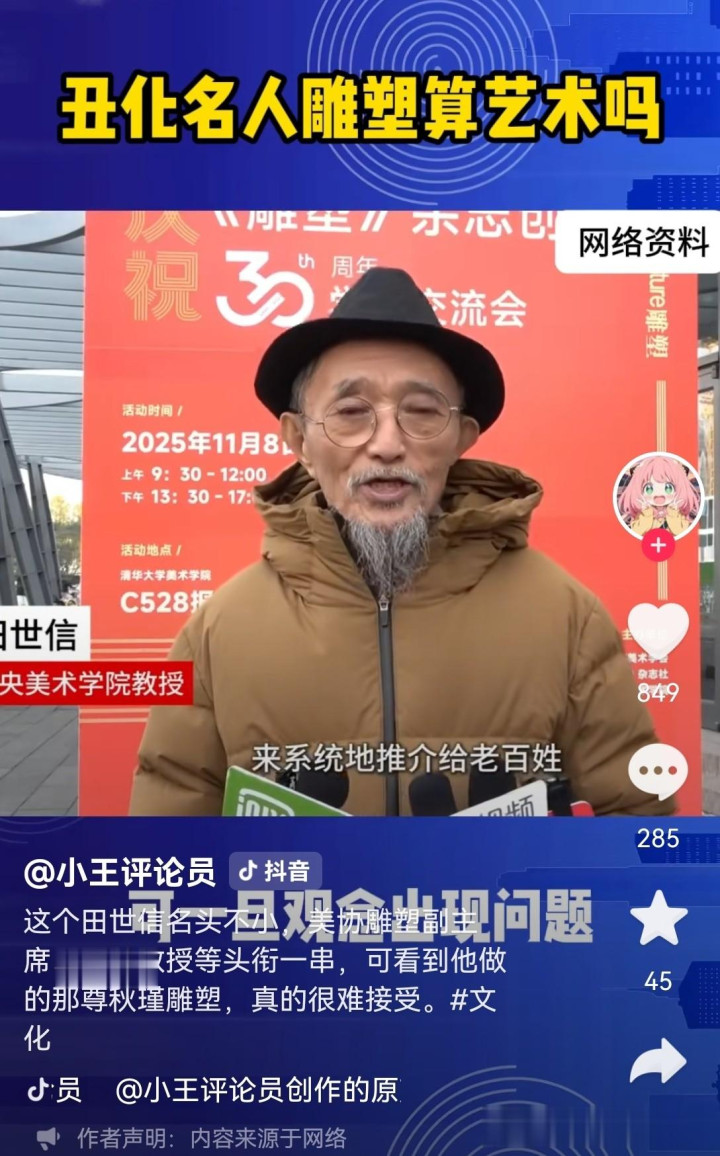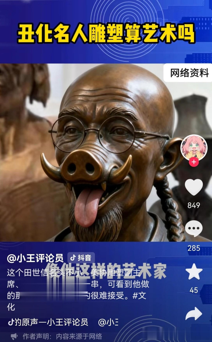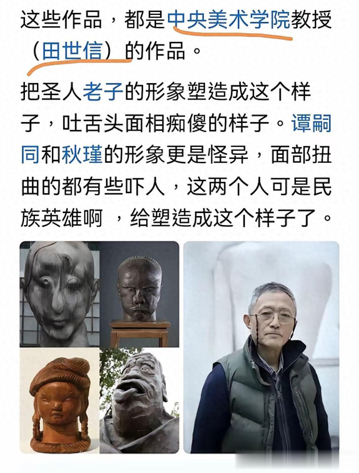 近日,中央美院教授田世信的系列雕塑作品引发全网公愤:将文化先贤老子塑造成吐舌露齿的怪诞模样,即便声称源自"刚柔之道"典故,仍被网友痛斥为背离公众认知的恶意解构;《侗女》刻意采用宽眼距、无眼珠的设计,明显迎合西方对亚裔的刻板印象,却以此在海外获奖换取认可;更令人愤慨的是,他将"鉴湖女侠"秋瑾这一民族英雄塑造成歪嘴咧眼的怪异形象,用低俗造型亵渎英烈尊严,严重伤害了民族情感。