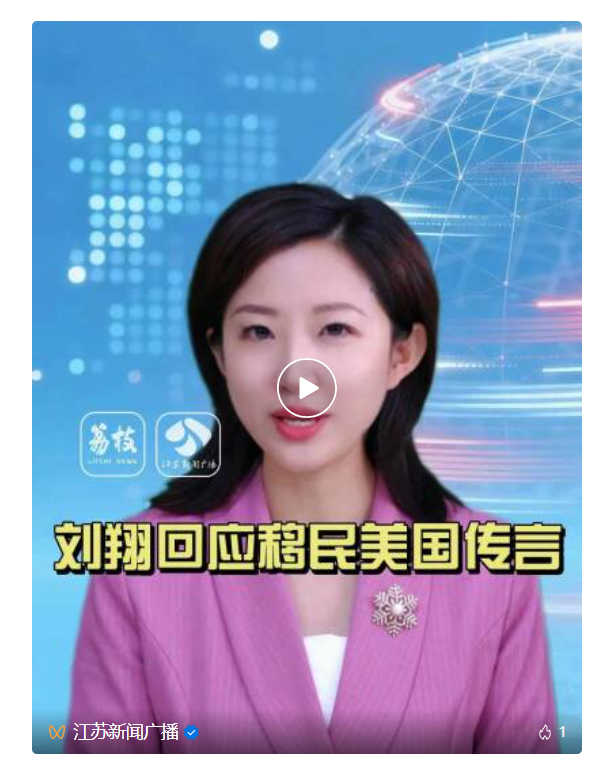 1月16日,据江苏新闻广播:42岁的中国前110米栏运动员刘翔今天通过个人社媒账号幽默回应移民美国的传言。