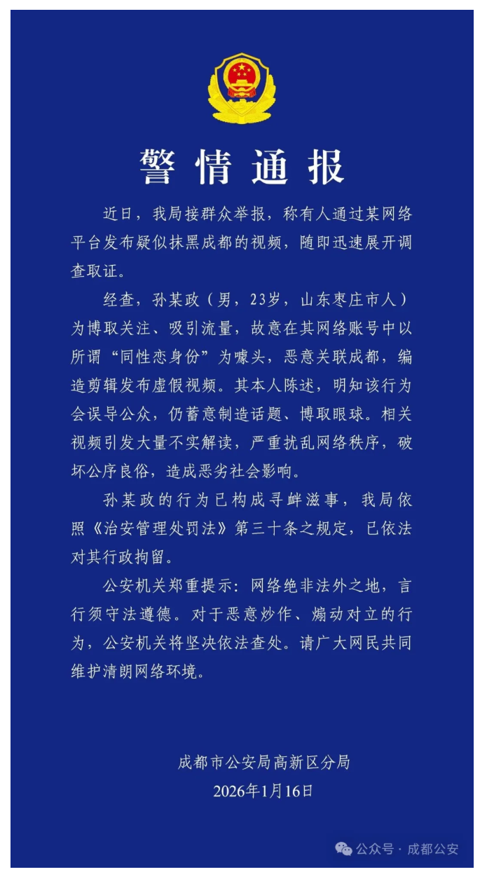 {jz:field.toptypename/}孙某政(男,23岁,山东枣庄市人)为博取关注、吸引流量,故意在其网络账号中以所谓“同性恋身份”为噱头,恶意关联成都,开云app在线体育编造剪辑发布虚假视频。其本人陈述,明知该行为会误导公众,仍蓄意制造话题、博取眼球。相关视频引发大量不实解读,严重扰乱网络秩序,破坏公序良俗,造成恶劣社会影响。孙某政的行为已构成寻衅滋事,警方依法对其行政拘留。