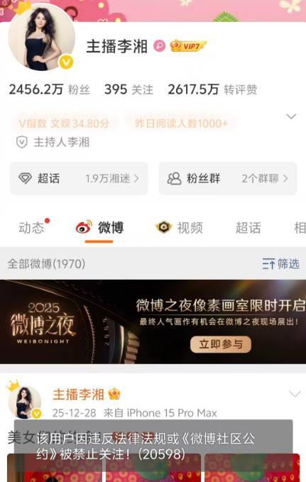 1月16日,极目新闻记者注意到,前湖南卫视主持人李湘的抖音、小红书和微博的账号被禁止关注。