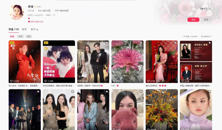 李湘在抖音有421万粉丝,在微博上有2456.2万粉丝,在小红书上有48.7万粉丝。