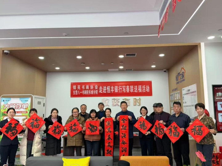 无联不成春,有联春意浓。为弘扬中华优秀传统文化,推进移风易俗,倡树文明新风,营造和谐团圆、书画飘香的氛围,1月23日上午,锦苑书画协会,东营八一书画院东城分院走进恒丰银行东城支行写春联送福活动。