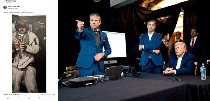 左图:2026年1月3日,特朗普在“真相社交”网站上发布了马杜罗在“硫磺岛”号军舰上的照片。(网页截图)