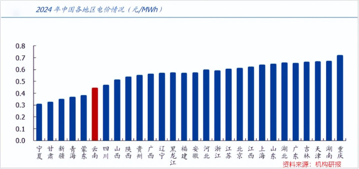 2024年,云南省电价低于0.5元/MWh,在天下处于较低水平。