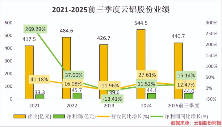 2025年前三季度,云铝股份已毕营收440.7亿元,同比增长12.47%,净利润44.0亿元,同比增长15.14%。