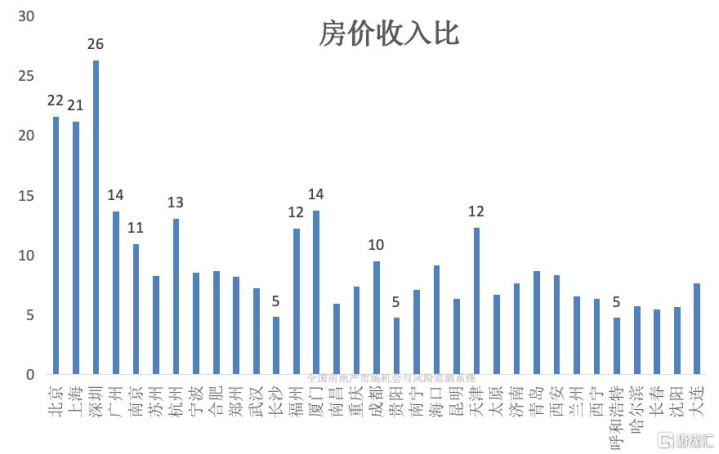 一线城市的房价收入比仍然高企:2025年深圳房价收入比为26、北京22、上海21、广州14。